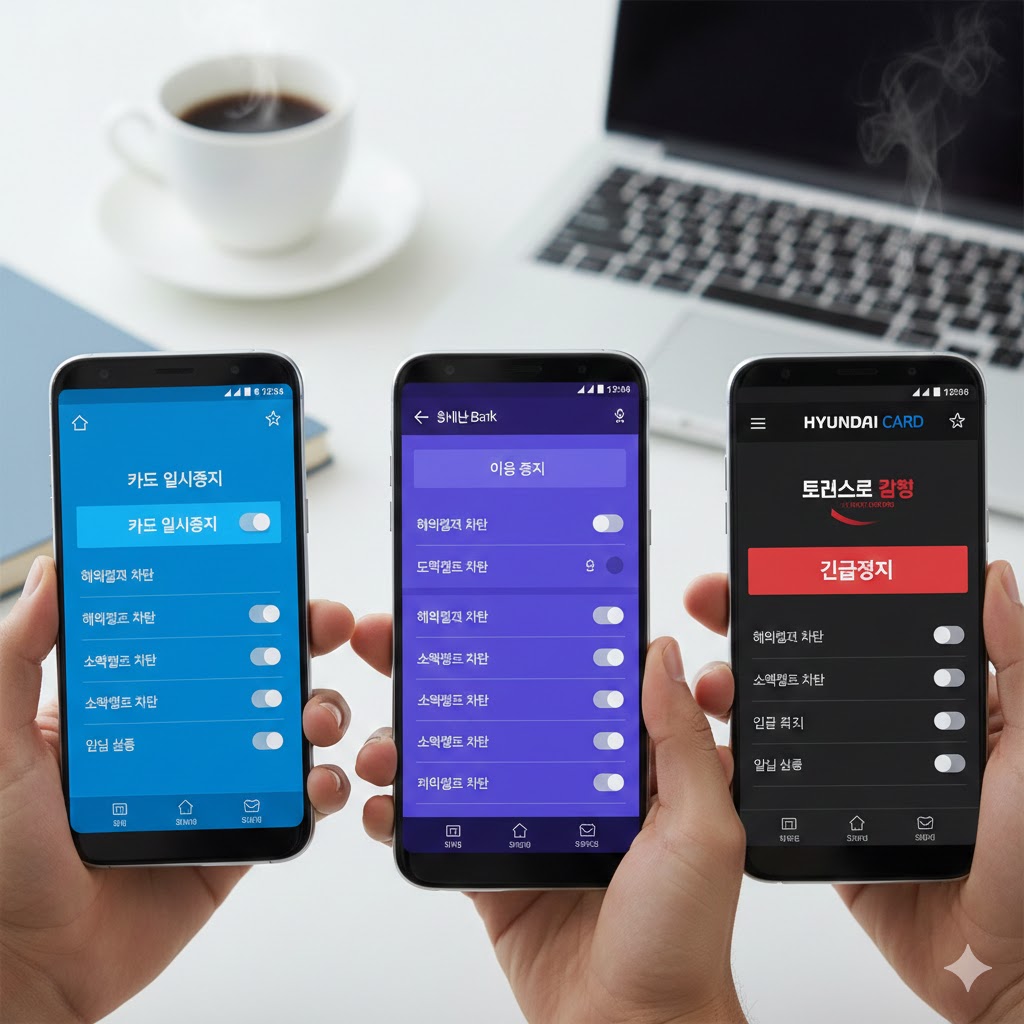 - 삼성: 카드 일시정지 / 신한: 이용 중지 / 현대: 긴급정지