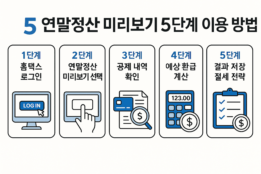 다행히도 국세청 홈택스에서는 연말정산 미리보기 서비스를 제공하고 있습니다. 이 서비스를 활용하면 연말이 오기 전에 미리 예상 세액을 확인하고, 부족한 공제 항목을 채워 넣어 환급액을 최대화할 수 있습니다. 이번 글에서는 홈택스 연말정산 미리 보기를 5단계로 나눠서 누구나 쉽게 따라 할 수 있도록 상세히 설명드리겠습니다.